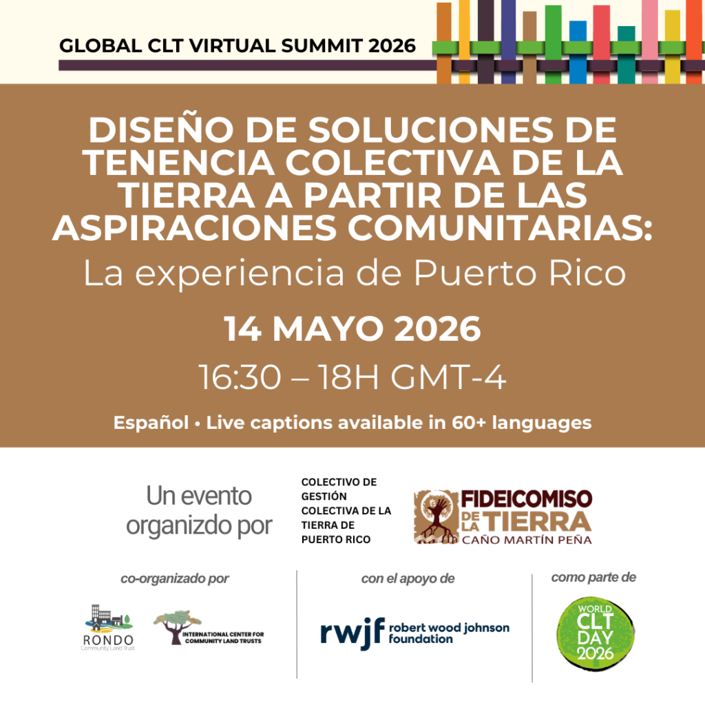 Este acto forma parte de la Cumbre Virtual 2026 sobre Fideicomisos Comunitarios de la Tierra (CLT), una serie de actos en línea de seis semanas de duración, del 5 de mayo al 10 de junio. Explora el programa completo e inscríbete en más actos aquí.