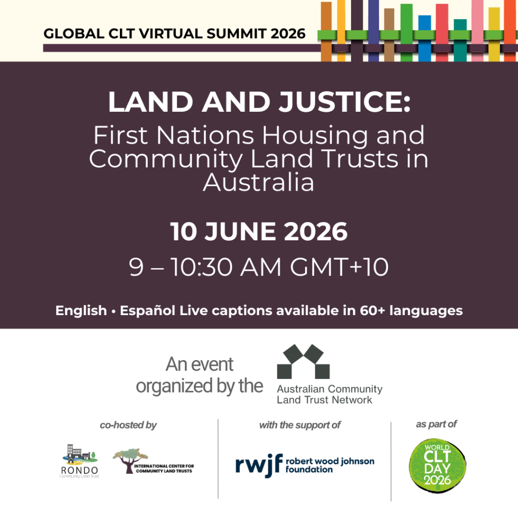 El 10 de junio, como acto final de la Cumbre Virtual Global de CLT 2026, la Red Australiana de Fideicomisos Comunitarios de la Tierra organizará una mesa redonda en la que se analizará el papel de los CLT en la promoción de la vivienda de las Primeras Naciones y la justicia de la tierra en Australia.
